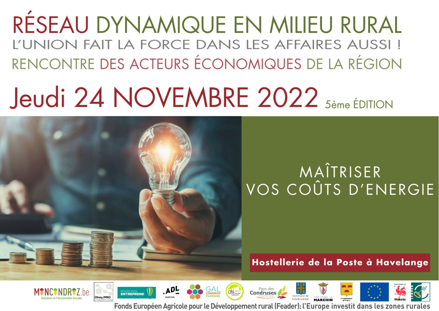 Jeudi dernier, pas moins de 55 entrepreneurs, commerçants et dirigeants de PME étaient présents à l’édition 2022 du Réseau Dynamique en Milieu Rural (RDMR), coorganisée par MonCondroz.be, Ohey.PRO, Marchin Entreprend, l’ADL Marchin, le GAL Condroz Famenne, le GAL Pays des tiges et chavées, Pays des Condruses et soutenue par les communes de Havelange, Marchin et Ohey.