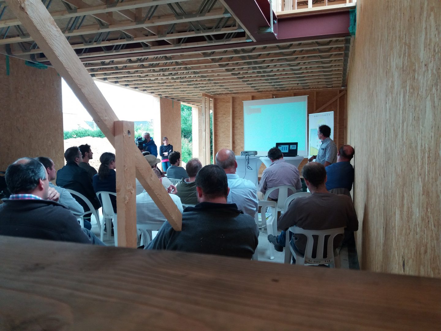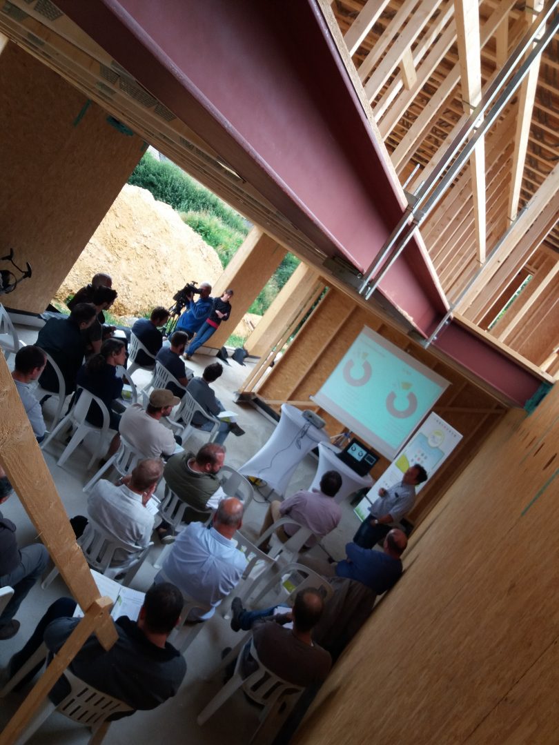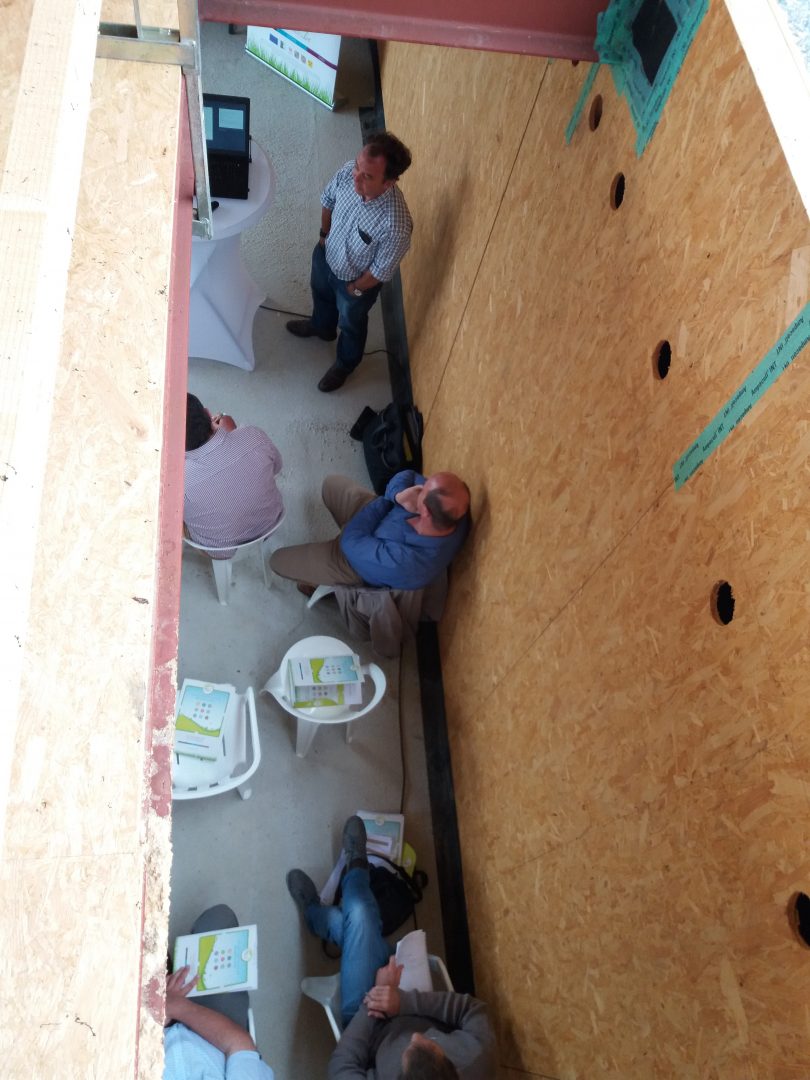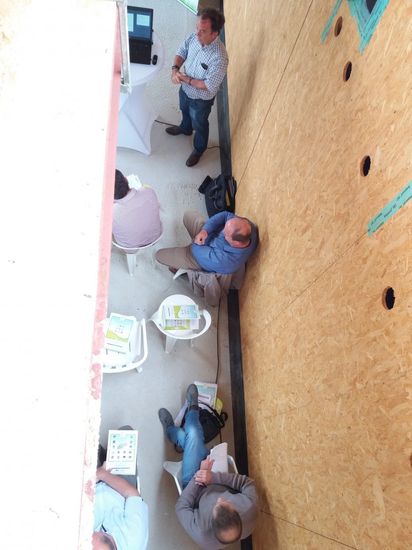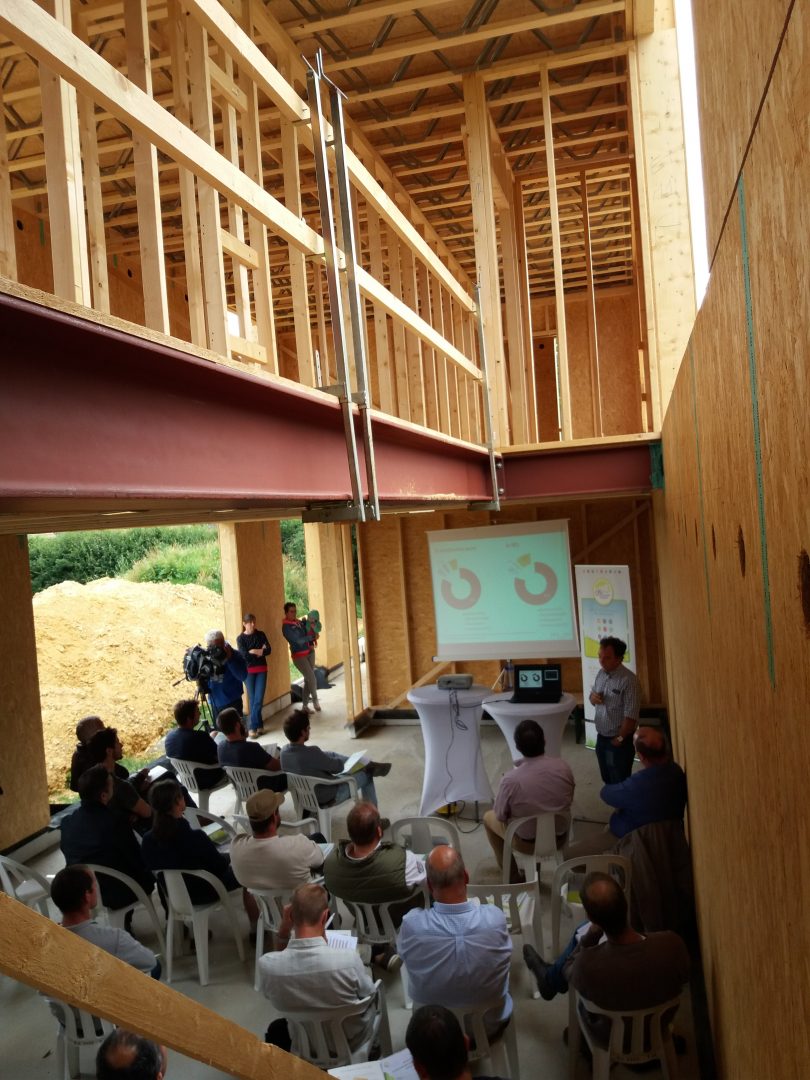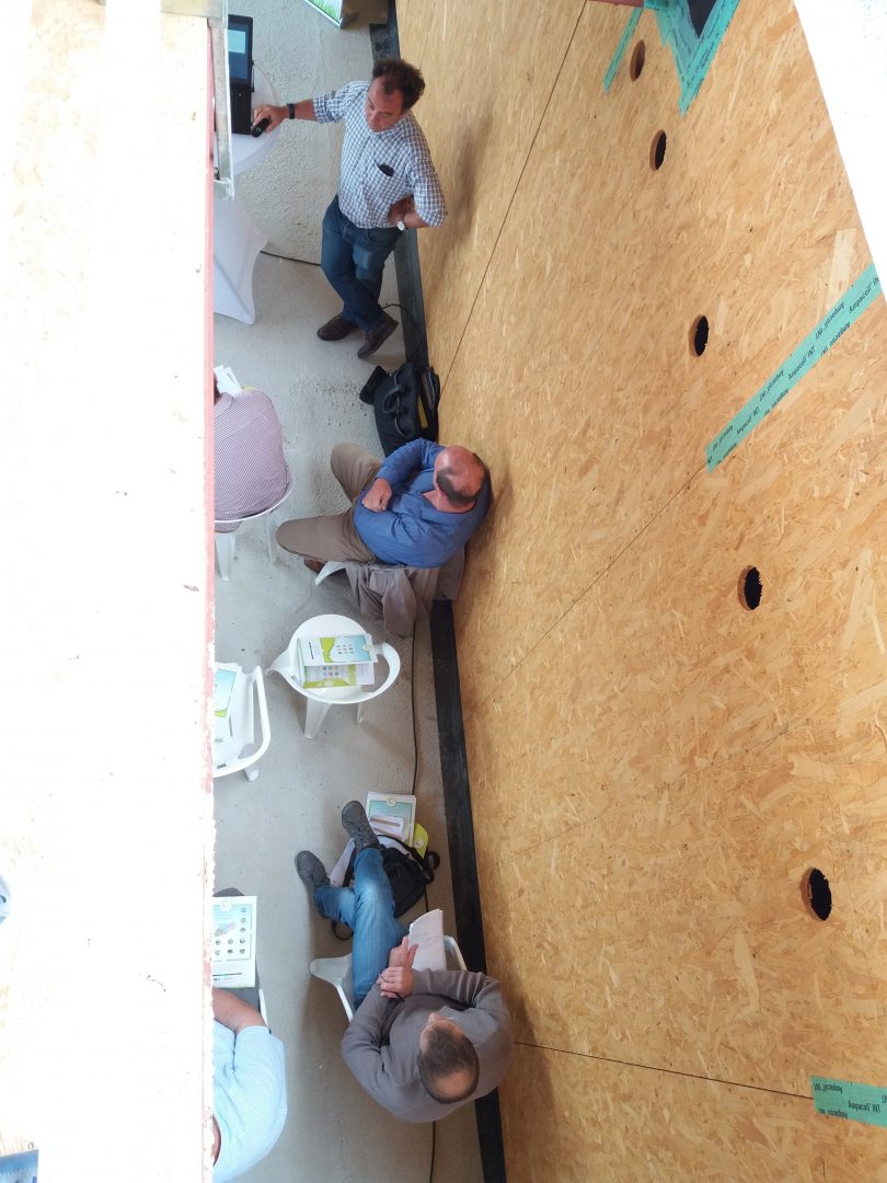Les participants ont ensuite pu visiter le chantier de construction d’une maison unifamiliale de la société Maisons Bois Meunier (Chimsco Groupe). L’occasion pour les architectes, les constructeurs bois, les menuisiers, scieurs et exploitants d’échanger sur les différentes techniques mises en œuvre et sur l’approvisionnement en bois. Des particuliers, intéressés de construire leur propre maison en bois étaient également présents et ont pu se faire une idée plus précise.